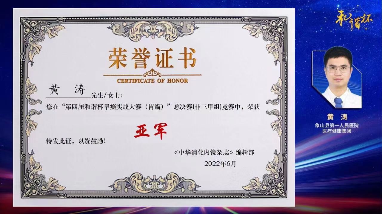近日,在全国第四届“和谐杯”早癌实战大赛(胃篇)总决赛(非三甲组)中,象山一院医健集团消化病学中心医生黄涛,以90分的成绩夺得亚军。